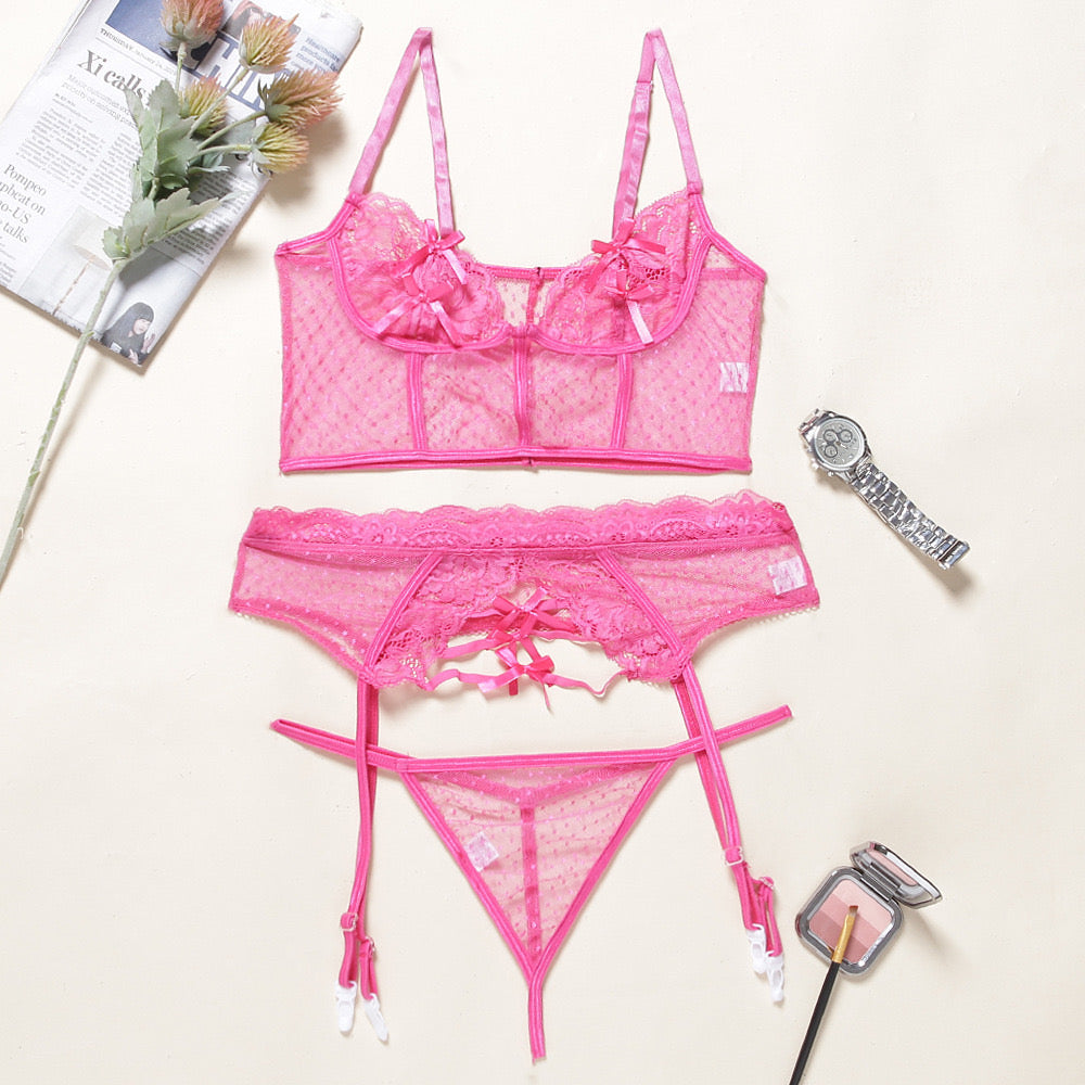 A beautiful hot pink 3 piece bra and thong set with garter beltÂ